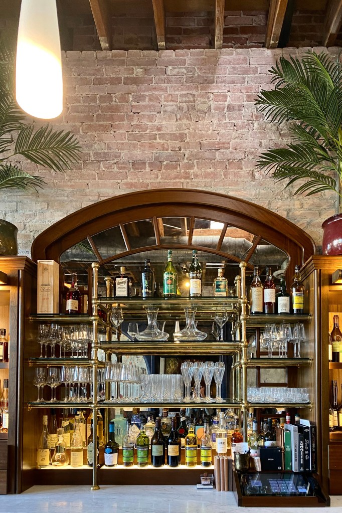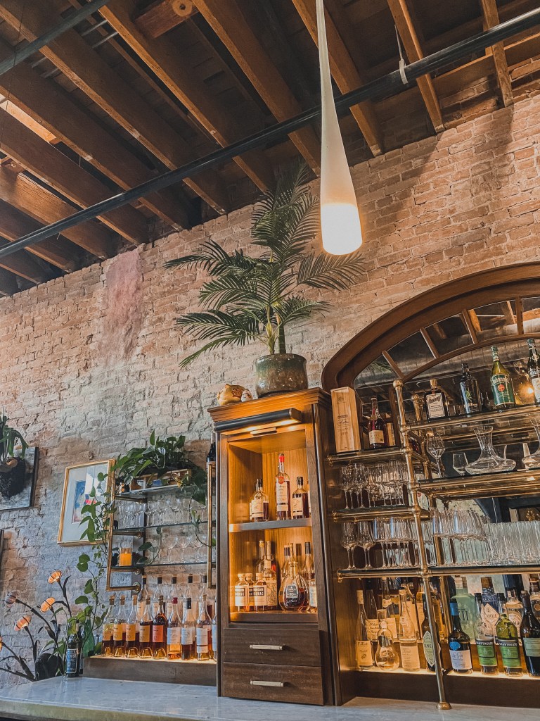 我自己坐在吧台,店面的擺設帶種家的舒適,酒櫃後方保留原始的紅磚牆,少了高檔餐廳的拘束感,多了幾分人情味