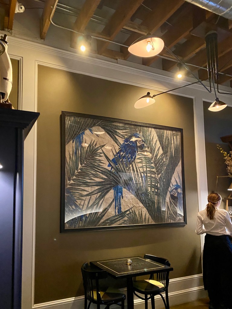 另外一區的用餐環境,鸚鵡、橄欖樹,充滿熱帶風情的畫作 An artwork